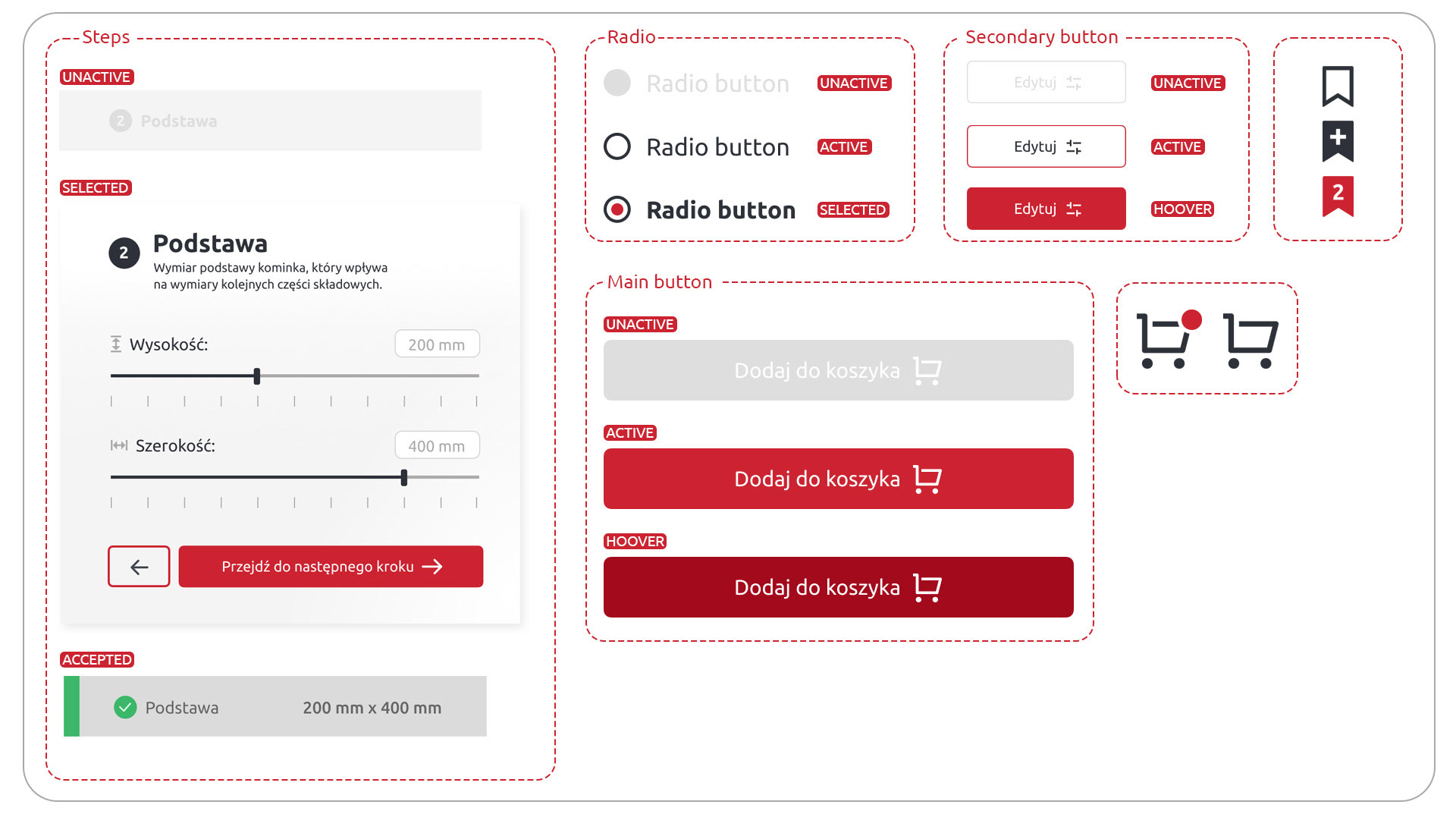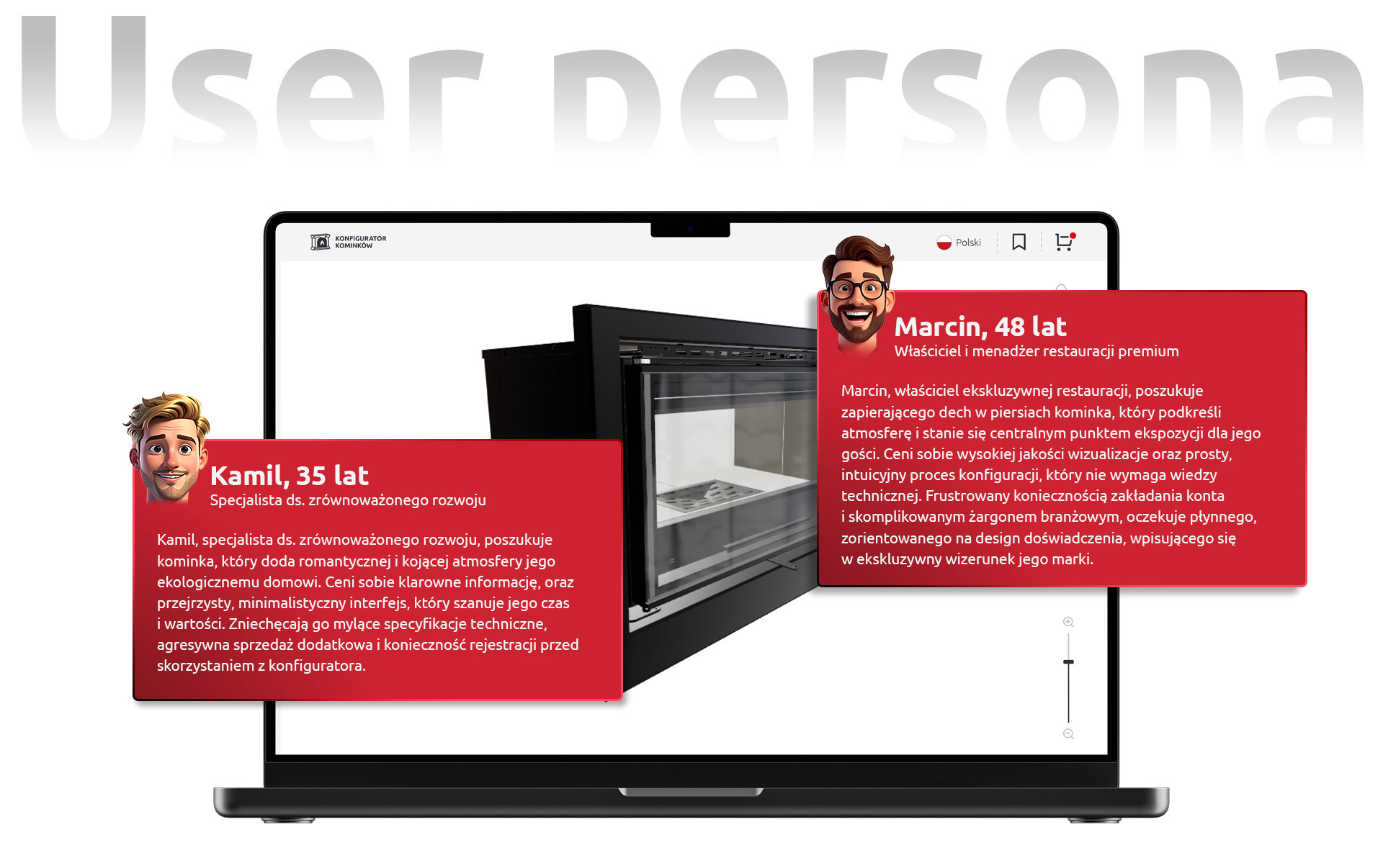 - Opracowanie intuicyjnej ścieżki użytkownika (User Flow), która krok po kroku prowadzi go przez proces komponowania własnego kominka;