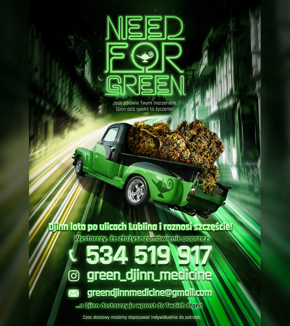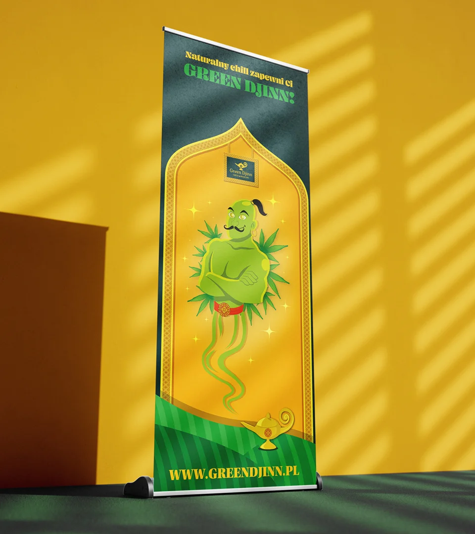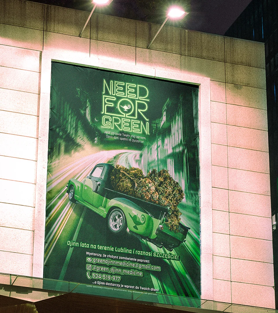To drive customer retention, I structured the visual assets for Djinn's Club, a loyalty program designed to incentivize engagement through branded membership cards and exclusive tiers. Expanding the service design into logistics, I developed the identity for Need for Green, a direct-to-consumer delivery service. This included a dedicated logomark and a dynamic key visual featuring a stylized pickup truck, effectively translating the brand's static imagery into a mobility context.