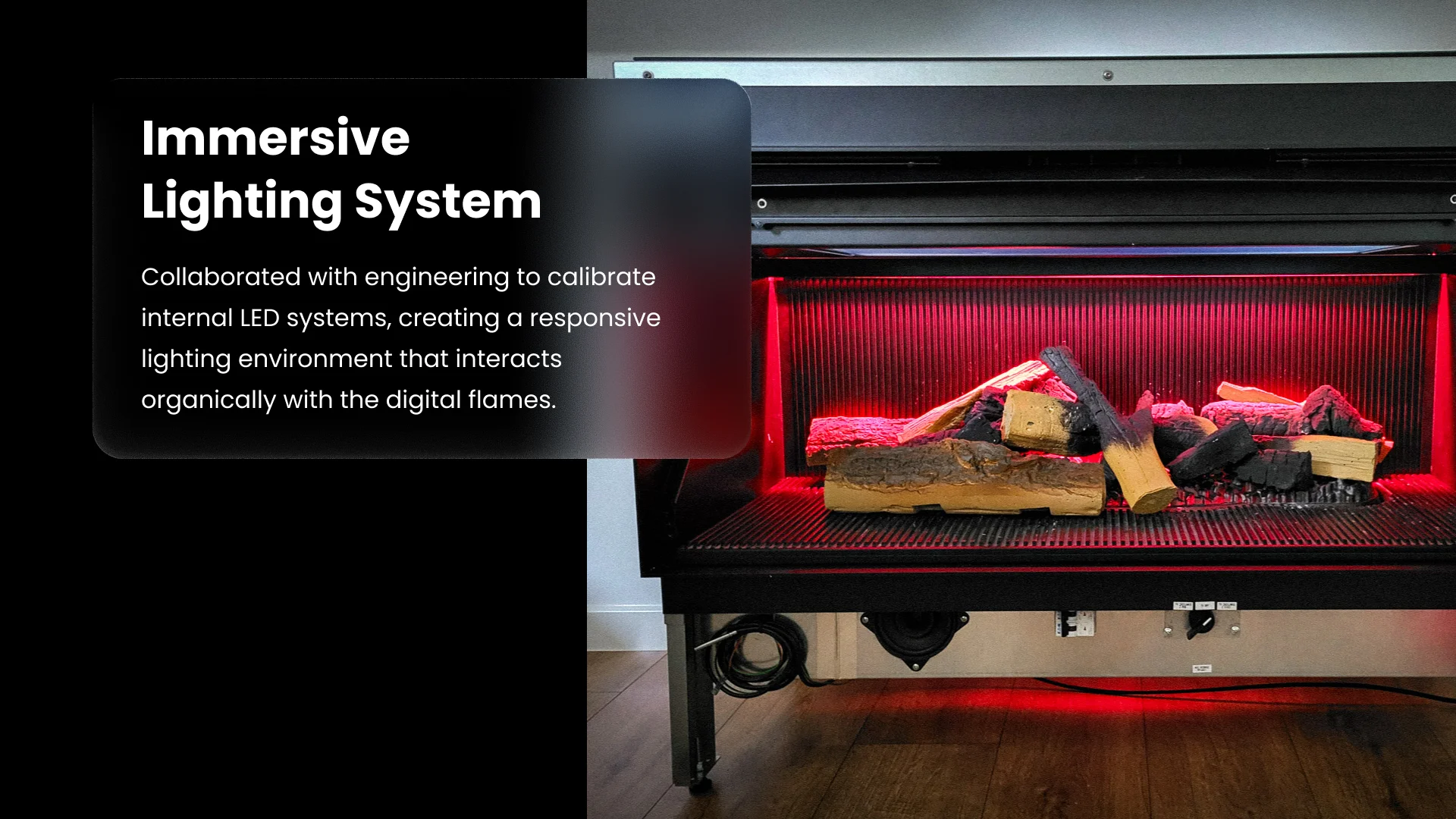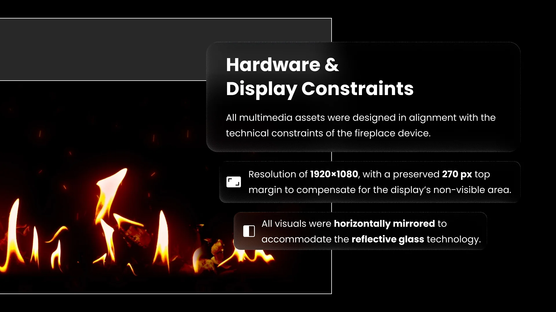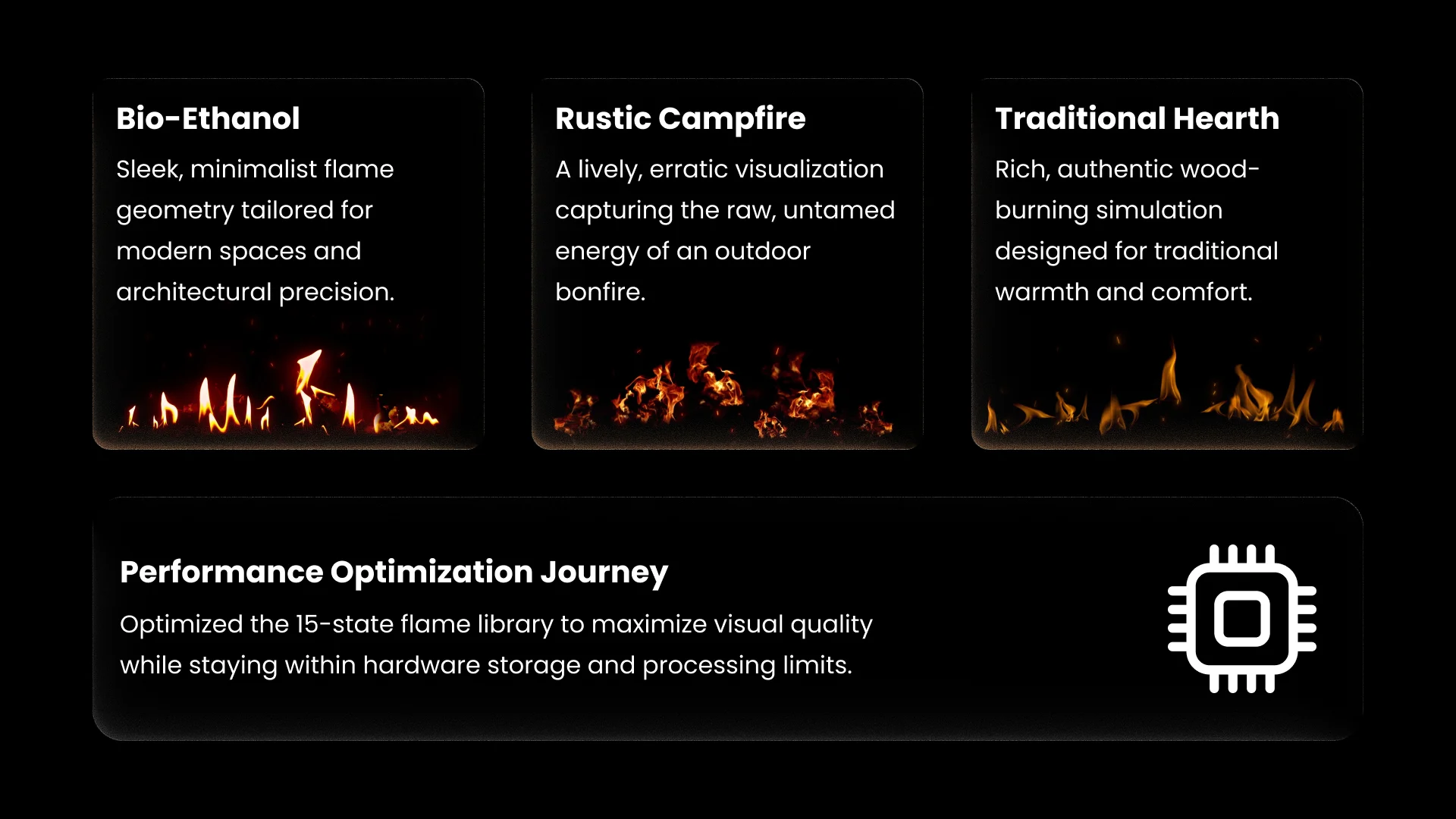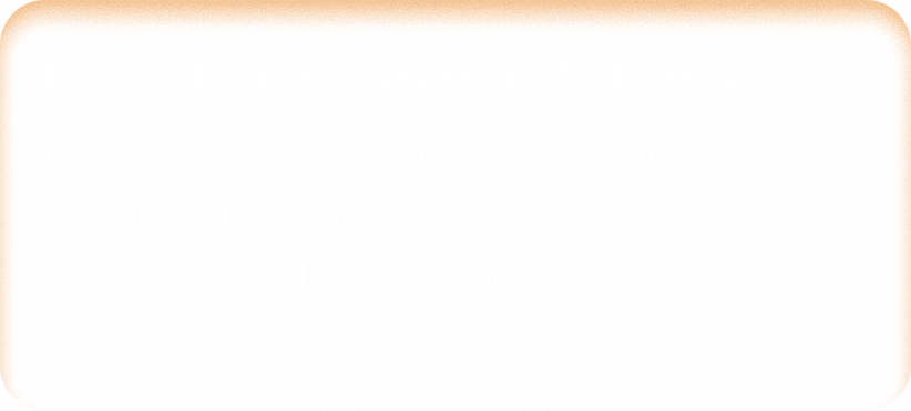 To bypass hardware limitations, I architected a "zero-overhead" rendering strategy. Instead of real-time processing, I implemented a pipeline of pre-mirrored, optimized loop containers. This reduced CPU load significantly, ensuring smooth playback. The visual experience is further grounded by a custom ambient lighting algorithm that synchronizes physical LEDs with the digital flame intensity, creating a cohesive sense of depth.
