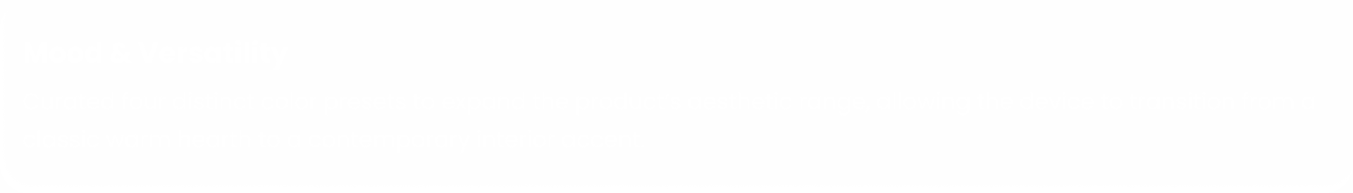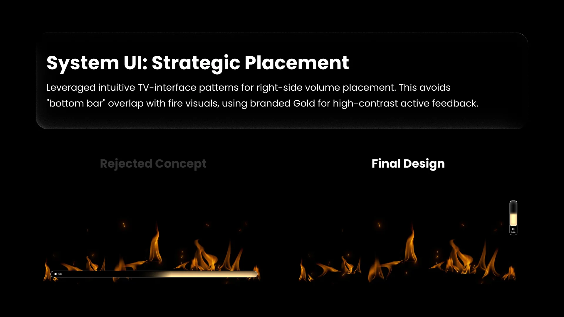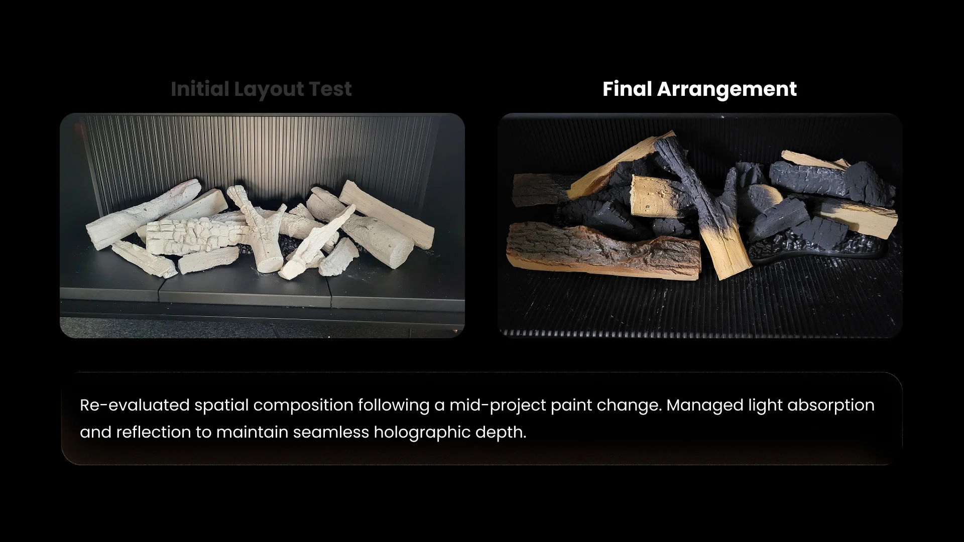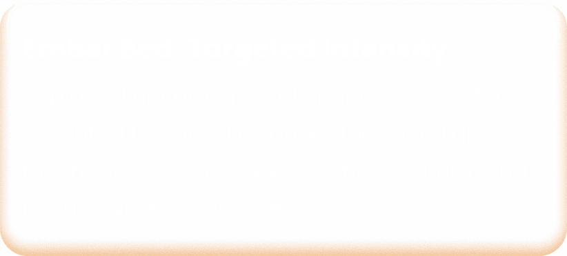 To bypass hardware limitations, I architected a "zero-overhead" rendering strategy. Instead of real-time processing, I implemented a pipeline of pre-mirrored, optimized loop containers. This reduced CPU load significantly, ensuring smooth playback. The visual experience is further grounded by a custom ambient lighting algorithm that synchronizes physical LEDs with the digital flame intensity, creating a cohesive sense of depth.
