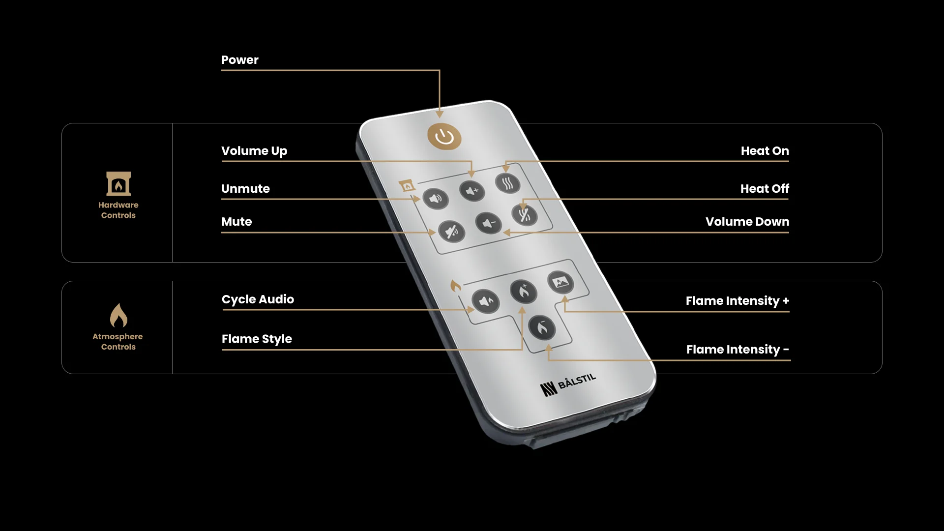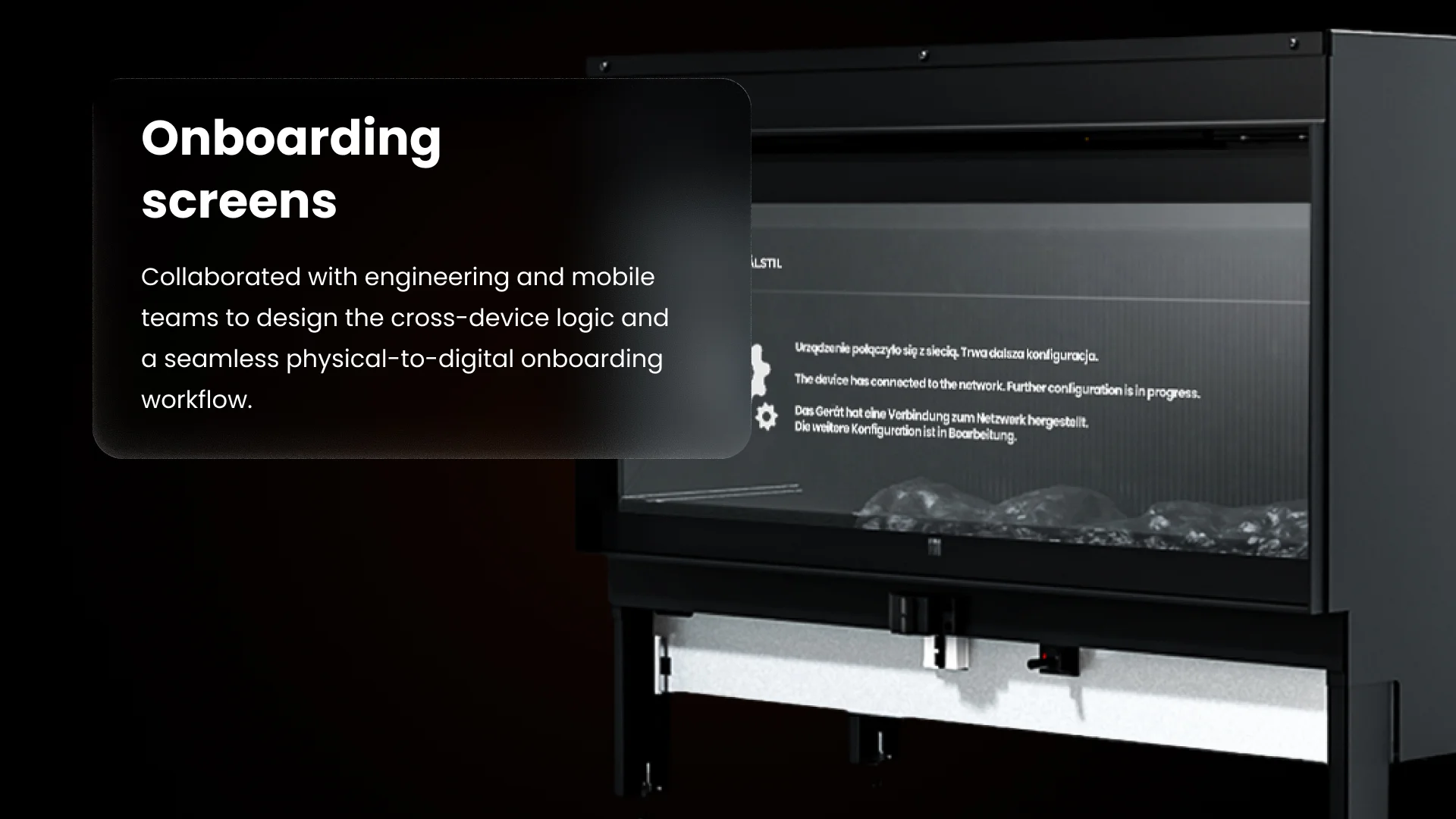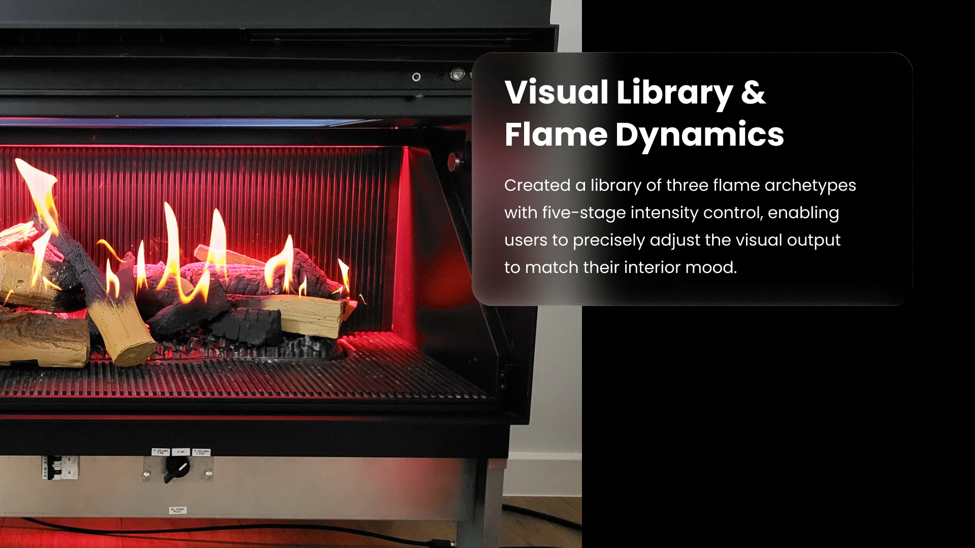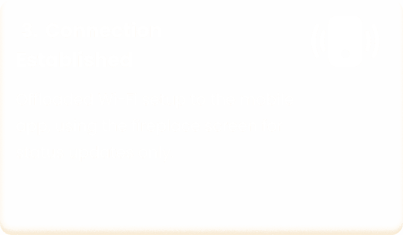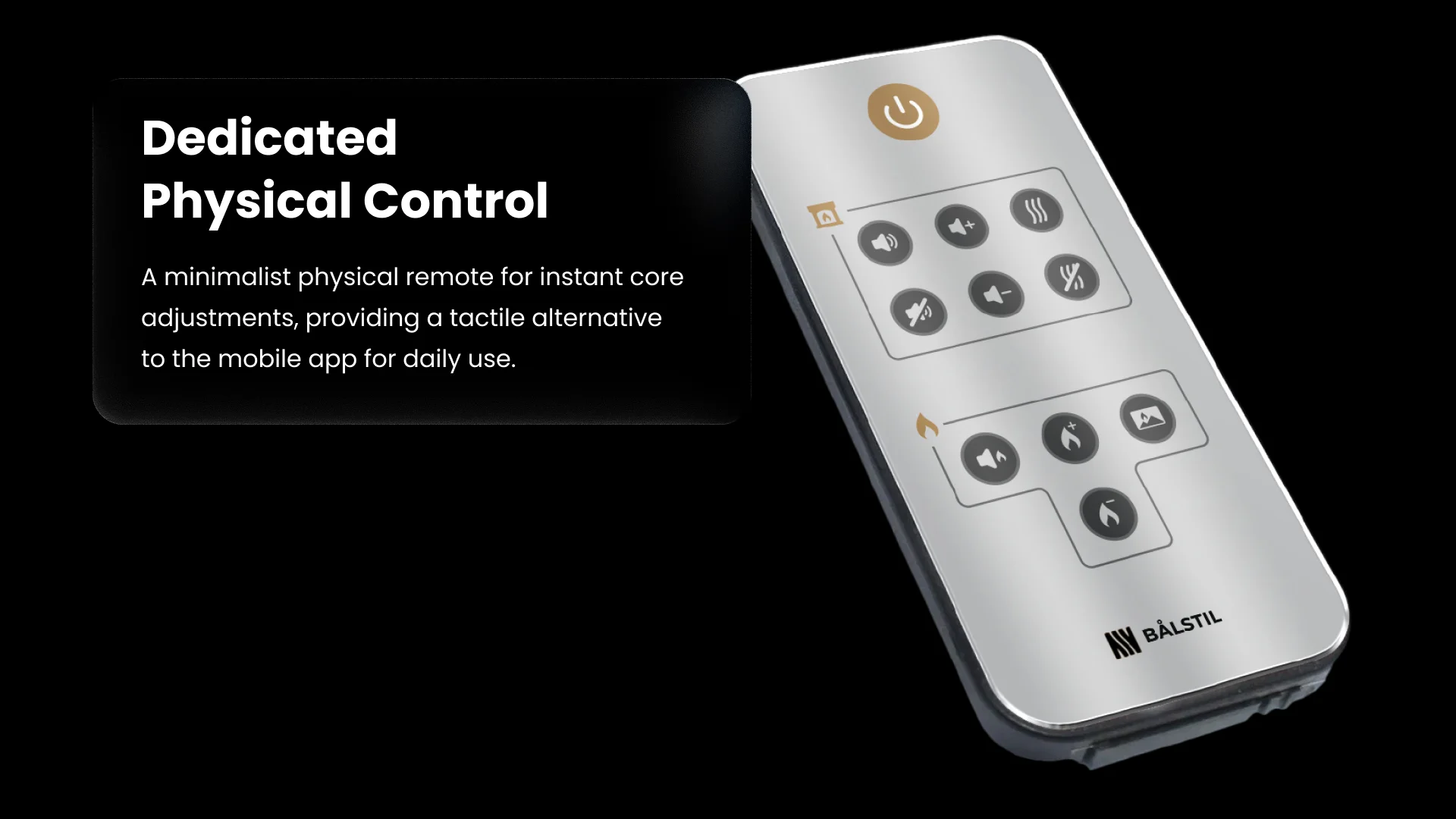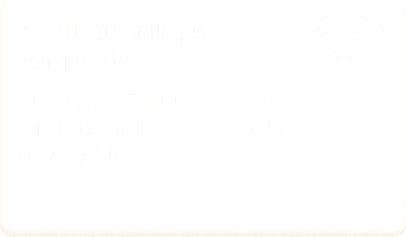 The interaction model was designed to be "invisible," treating the device as furniture rather than a computer. I decoupled complex setup tasks (like Wi-Fi configuration) to a companion mobile app, keeping the fireplace display immersion-focused. The physical remote control utilizes a zoned architecture, separating utility functions from atmospheric adjustments to allow for intuitive, muscle-memory operation.